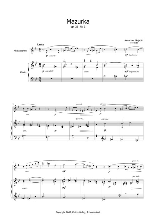 Hervorragendes Vortragsstück in der typisch spätromantischen Harmonik Scrjabins. Nicht zu schwer, aber sehr ausdrucksstark.