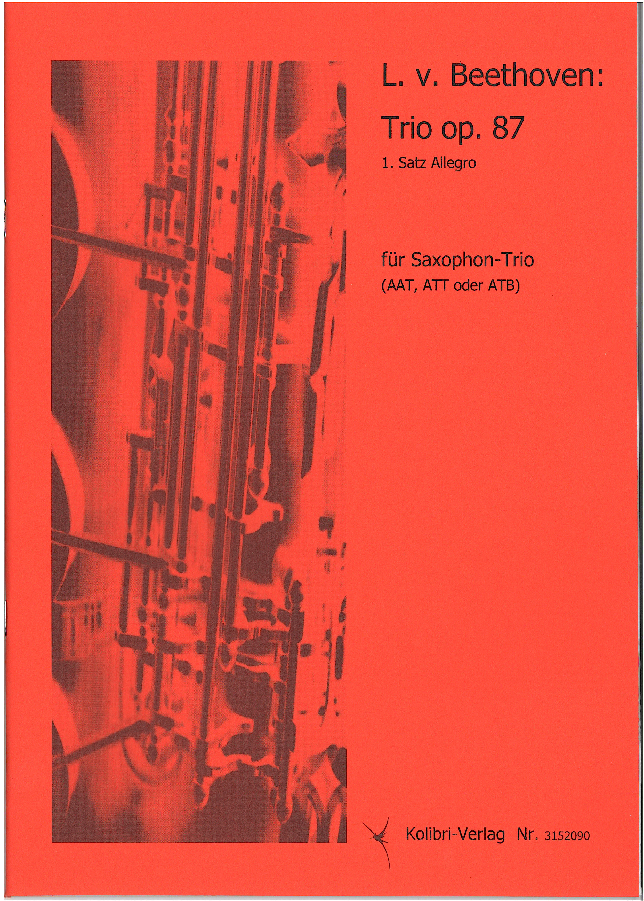 Ludwig van Beethovens Trio op. 87 in C-Dur zählt zu den beliebtesten kammermusikalischen Bläserwerken des Komponisten für zwei Oboen und Englischhorn. Der erste Satz ist ganz im Geist der damals vorherrschenden Sonatenhauptsatzform komponiert, wobei sich bereits hier Beethovens Genialität in der motivischen Arbeit, wie er Themen weiterentwickelt und in der Durchführung geschickt durch Modulationen führt, zeigt. Bis auf wenige Ausnahmen entspricht diese Fassung für Saxophon-Trio den Originalstimmen und Vortragsangaben.
